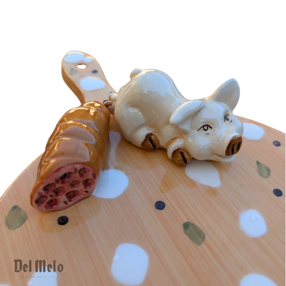 Decorato a mano e con maialini e salame, sempre in ceramica decorata a mano, applicati.